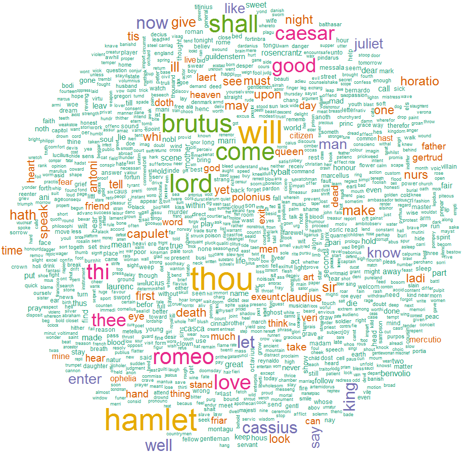 Word cloud of all words in 3 Shakespeare’s tragedies: Hamlet, Julius Caesar, Romeo and Juliet